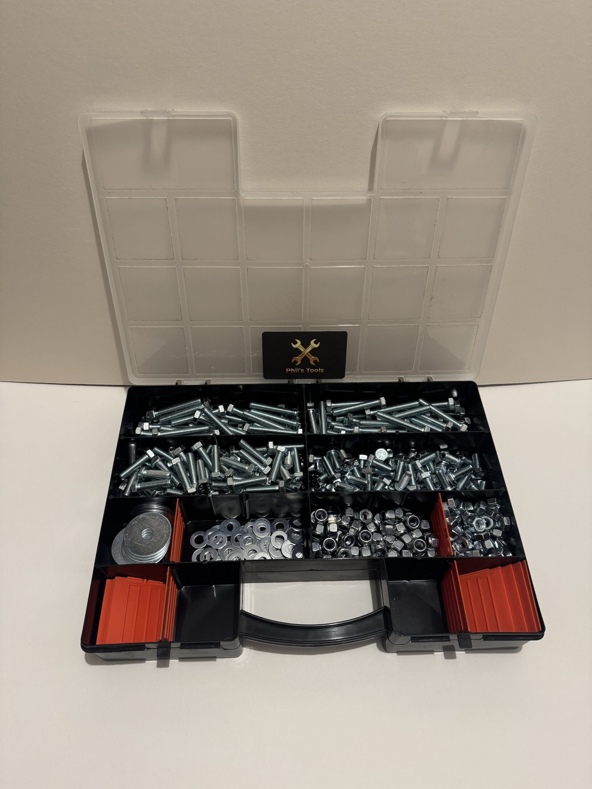 M8 bolts, repair washers, nylock nuts and normal nuts. In a compartment box